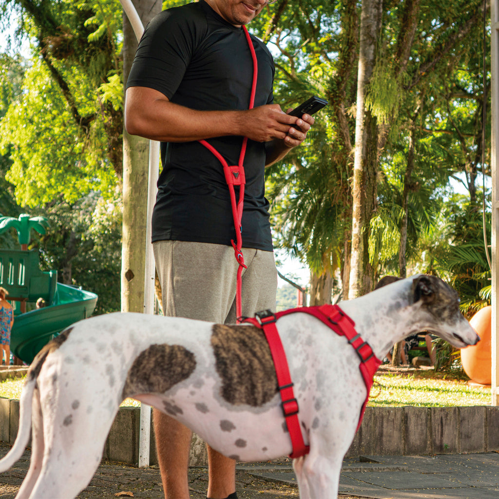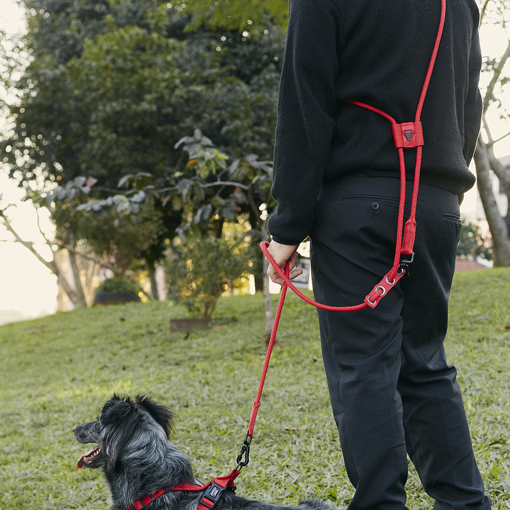 Para usar no modo mãos livres, ajuste a guia com o regulador e posicione na altura da cintura ou diagonal no peito. Se for usar com dois cães, forme uma alça central e conecte cada lado em um doguinho. Simples, prático e eficiente!
